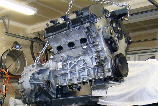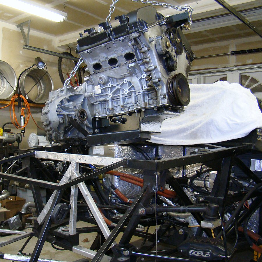 Its much easier to rebuild an engine when it's out of the car.  The Noble's removable rear bodywork (a.k.a the clam) means that everything is accessible, and engine plucks are pretty easy for one guy in his garage.  A 3-point chain arrangement keeps the whole thing level.
