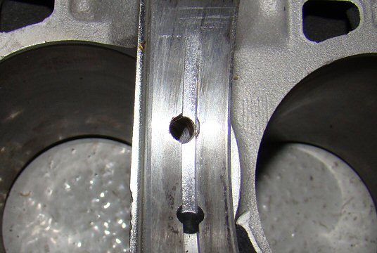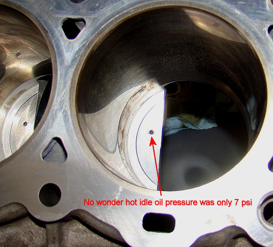 The Noble engine includes oil squirters aimed at the bottom of the pistons, which is good.  However, the implementation amounts to a sizable internal oil leak off the crankshaft main bearings, which is bad.  My warm engine idle oil pressure was less than 10 psi.  The big hole feeding the squirter shown in the pic above was the reason.  The lower hole is main bearing oil supply, the upper hole is leads to the squirter.