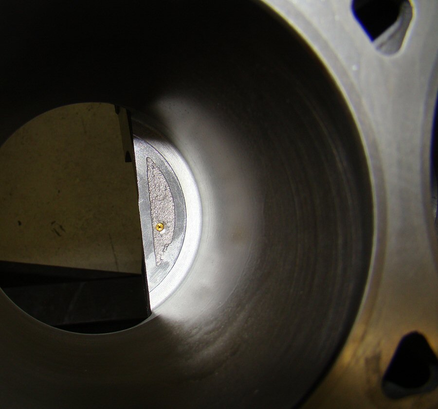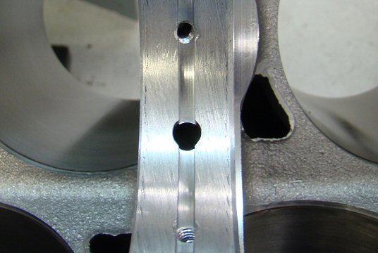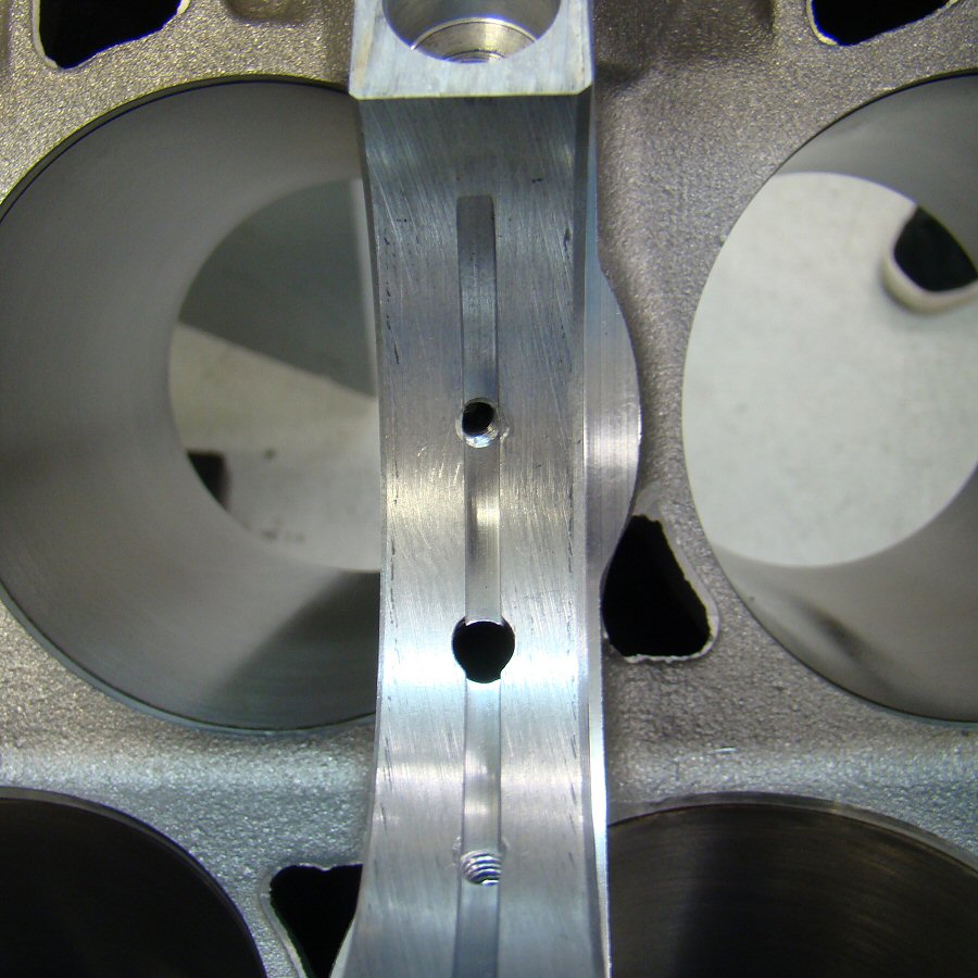 My new block has been machined for proper piston squirters that incorporate brass nozzles.  The supply holes are much smaller.  Engine builder Dave Rebello said that factory Noble blocks crack at the squirter holes when the boost is turned way up.