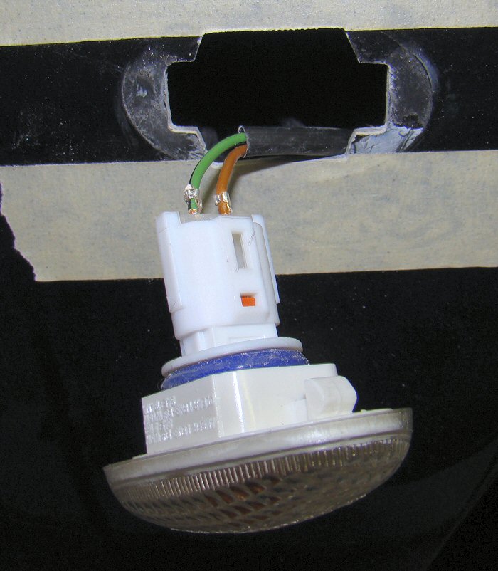 Yellow side marker lights on a black car bug me. They look wrong. I found white lights with a very similar form factor except for the electrical connector. I found that a common Molex part number (used to be sold at Radio Shack) had the right pin spacing. A little hobby knife surgery was required, but I ended up with a mating connector pair.