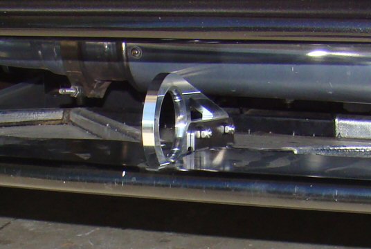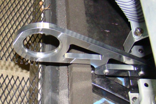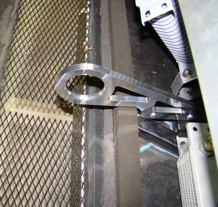 Here is the raw CNC'ed front hook installed on my car using the factory mounting tabs welded to the frame. The ring part of the hook projects through the expanded metal mesh.