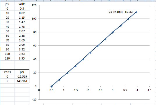 Plugging pressure and voltage values into Excel resulted in this nicely linear calibration curve. Since it's linear, I can use two calibration points in my ECU.