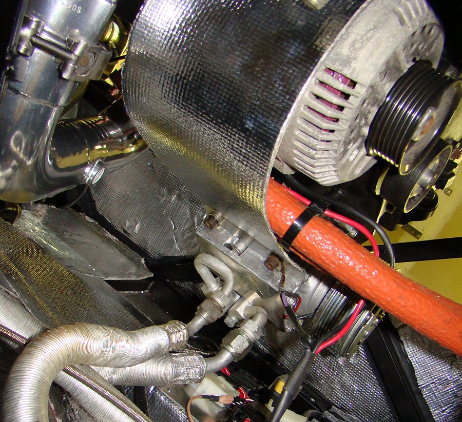 Nobles are somewhat infamous for melting alternator wiring because of its proximity to the front turbo. My single turbo conversion means that I no longer have a front turbo, but I still have an exhaust pipe near the alternator that I'm sure glows at least cherry red when I'm in boost. I made this heat shield to protect the alternator and its wiring. Note that all the red, rubberized fiberglass tubing used by Noble has been replaced. This is an old pic!