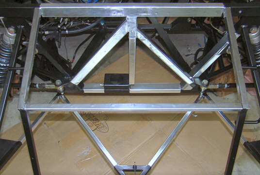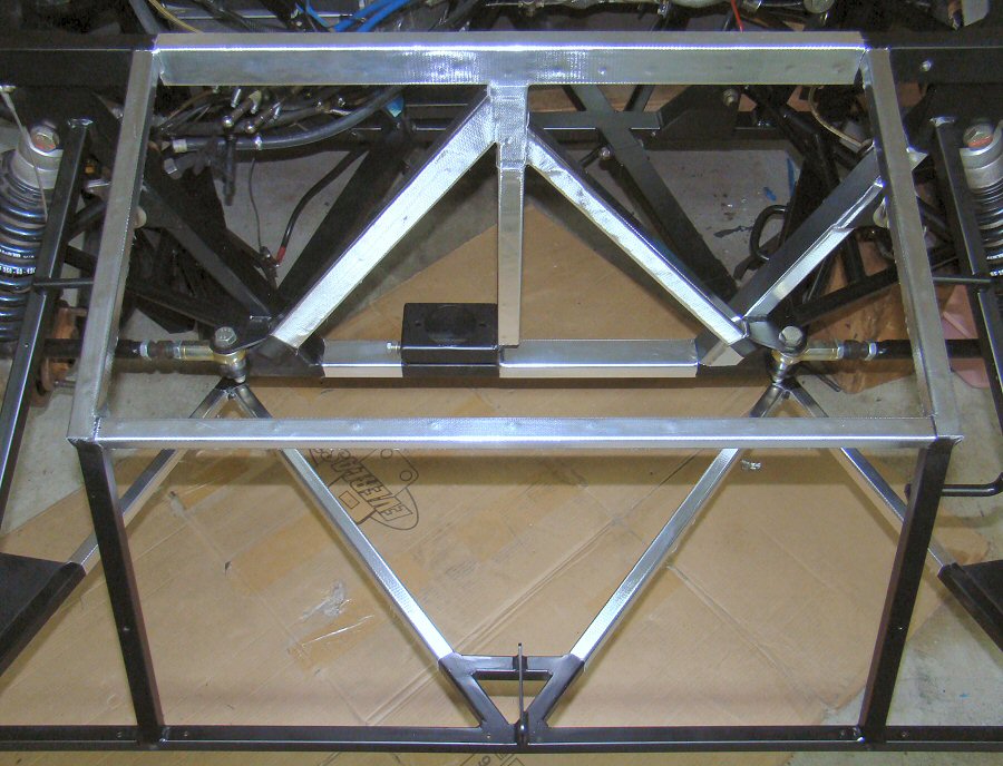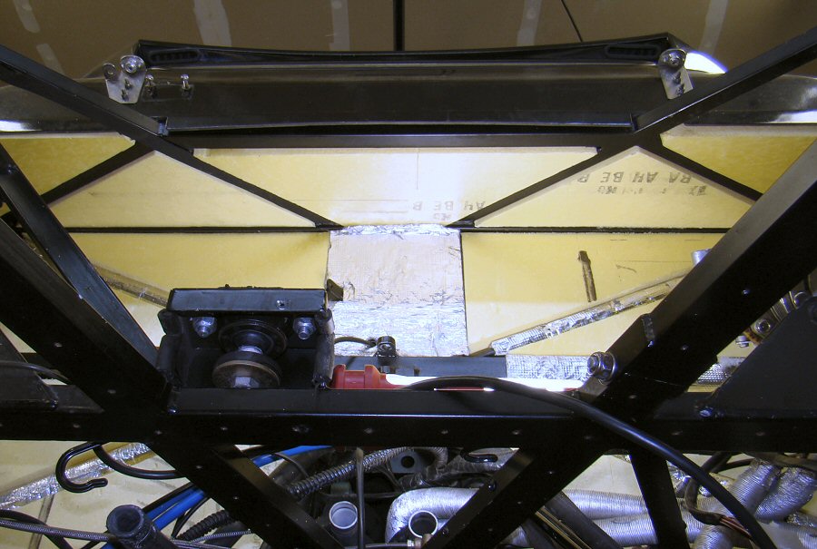 I cut more foam for the horizontal deck area below the rear window. This pic might be confusing at first - you are looking up from the garage floor through the chassis frame rails. The foam wedges that you see from about 1/3 of the way from the bottom of the pic to 2/3 from the bottom are vertical. They rest against the firewall separating the interior from the engine bay. The foam wedges you see in the top 1/3 of the pic are horizontal. Directly above them is a horizontal shelf that is below the rear window.