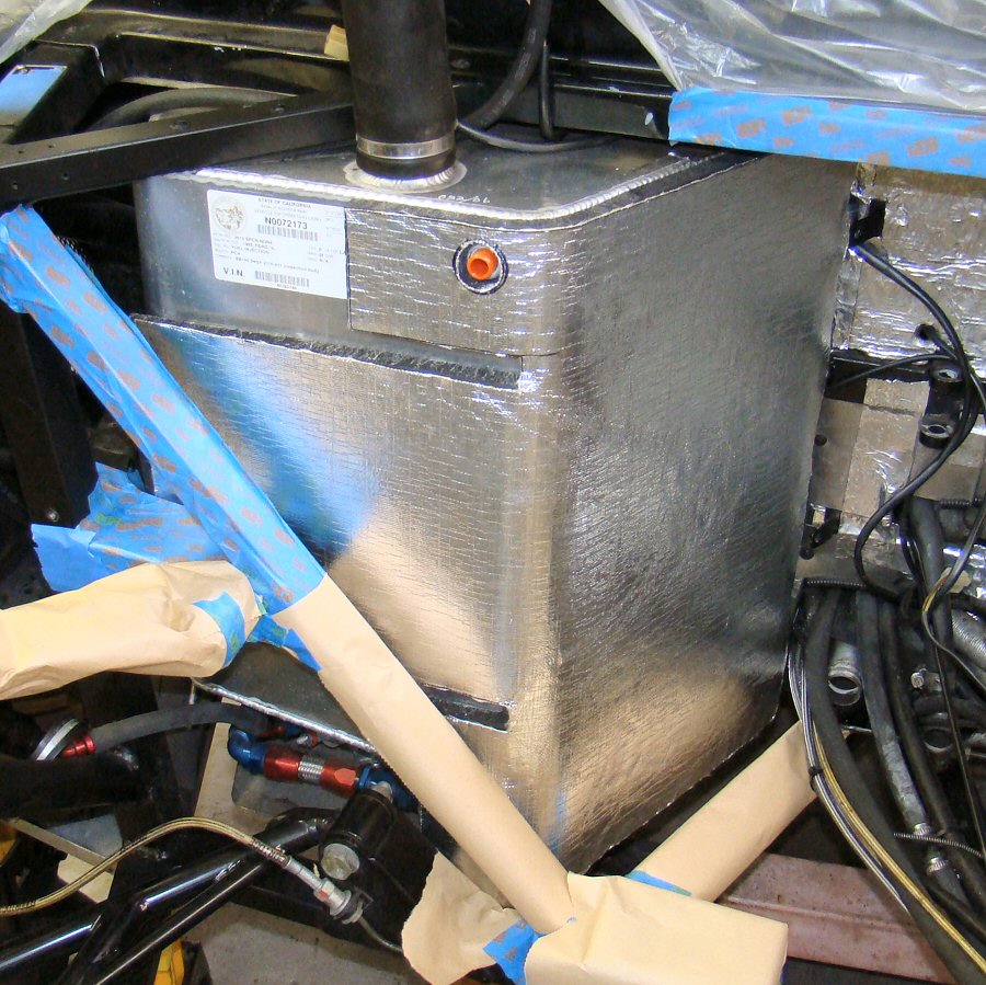 Noble had applied a radiant barrier to my fuel tank, but it arrived pretty badly beaten, then the tank was reworked to create a sump and a garage for the fuel pump (detailed on the Fuel page). I removed all the factory material (not fun) and made this template for new foam insulation.