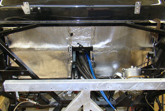 This pic could have been on my page about creating a better looking engine bay. After painting the frame tubes with a paint that matched the factory powder coat, I replaced the factory radiant barrier with new stuff. I used a self adhesive barrier for this application, and I'll update the site when I remember exactly what it is. Note that I've covered all the screw holes formerly used for the air/air intercooler enclosure. I no longer use that enclosure, and this was an easy way to keep water out of the frame tubes.