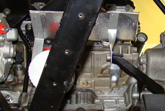 Noble provided a radiant barrier to shield the oil filter and cooler lines from the front bank exhaust header. But it bolted to the exhaust header studs. Call me picky, but why couple a heat shield directly with the heat source? I made this heat barrier and bolted it to the block. As usual, both sides are covered with DEI radiant barrier material.