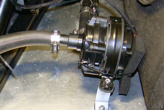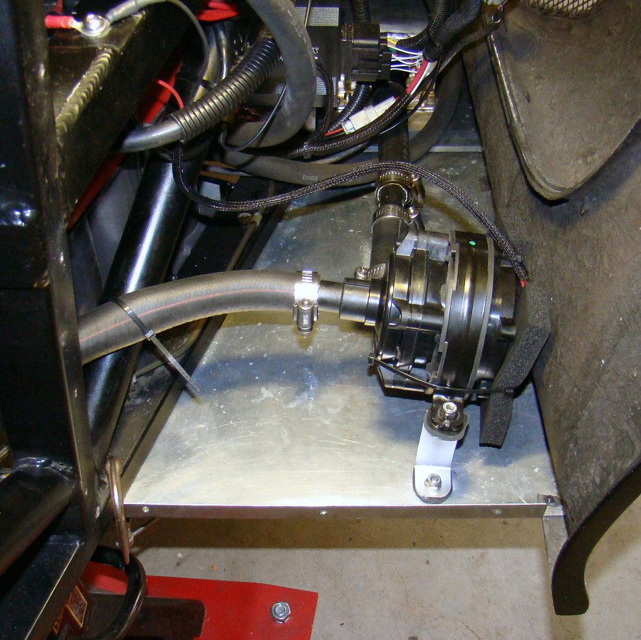 I did a lot of research on water pumps before settling on this GM part number that was used for the ZL1 supercharged Camaro intercooler. Lingenfelter published pump flow data on their web site showing that this pump had sufficient flow for my application. Since it's a GM factory part used on a production car, I have reason to believe it is more thoroughly engineered and tested than most aftermarket parts. That should translate into a long, trouble-free life. I hope. This pic is a bit stale - the pump is now mounted with the inlet pointing straight up. Same location, though, and I was able to reuse the bent aluminum mounting bracket.
