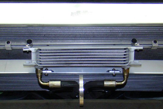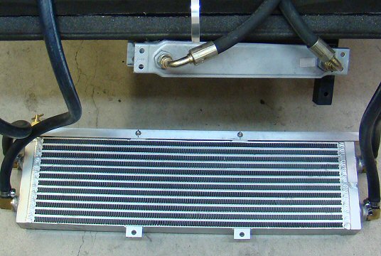 Finding an appropriate radiator was the most time consuming part of this conversion. I wanted the widest possible core, and one that was fairly tall, but not so tall that it covered all of the engine coolant radiator. This radiator is close to ideal. With inlet and outlet elbows installed as shown, it just barely fits. But fit it does, and without the elbows rubbing. This part was designed to be dual pass (inlet and outlet on the left end with a u-turn on the right end). Craig Hill welded two new bungs on the right end so that water flows left-to-right through the whole core.