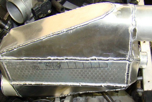 I bought the core from Garrett and had fabricator buddy Alan Blaine of Blaine Fab build the air and water end tanks to my design. The air tank tapers are intended to equalize flow across the core. There are lots of good tank design resources online and in print.