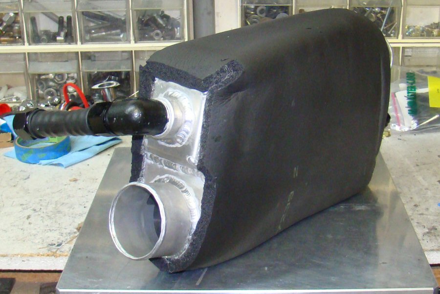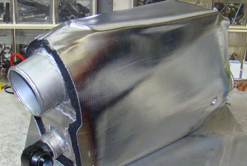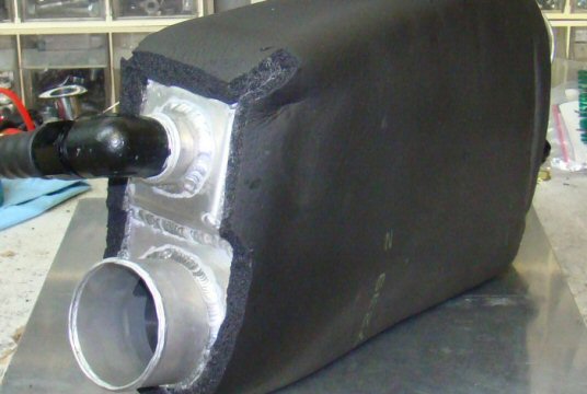 Since an intercooler's job is to cool charge air from the turbo, and since the engine bay is typically a pretty hot environment, the intercooler must be insulated. I wrapped mine with dense, flexible insulation foam from McMaster after first coating it with high temp aerosol adhesive from 3M.