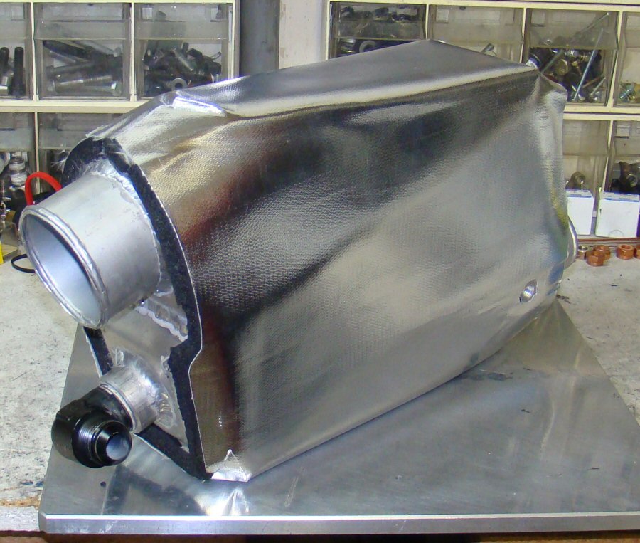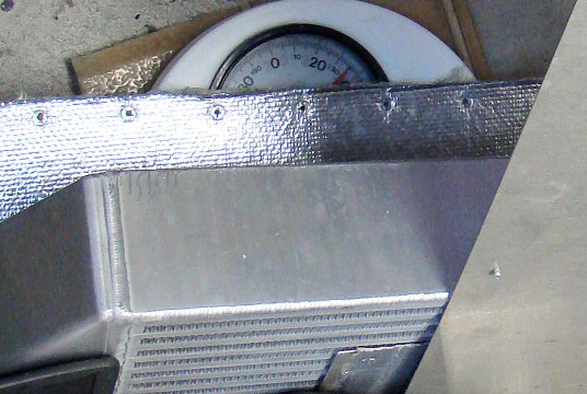 Intercooler insulation step 2 was adding a radiant barrier. This is the same self-adhesive product that I used for the fuel tank. The bung near the right side of the pic is for my intake air temperature sensor.
