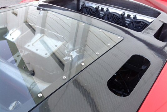 Here is a fastback clam on a Noble. It's clear that the air/air intercooler still needs a wall of fans. Can you see how much fin area is blocked by those fans? Fans may be helpful when you're not moving, or idling through the paddock, but they become an obstacle to flow when going fast. This is not an example of good engineering.